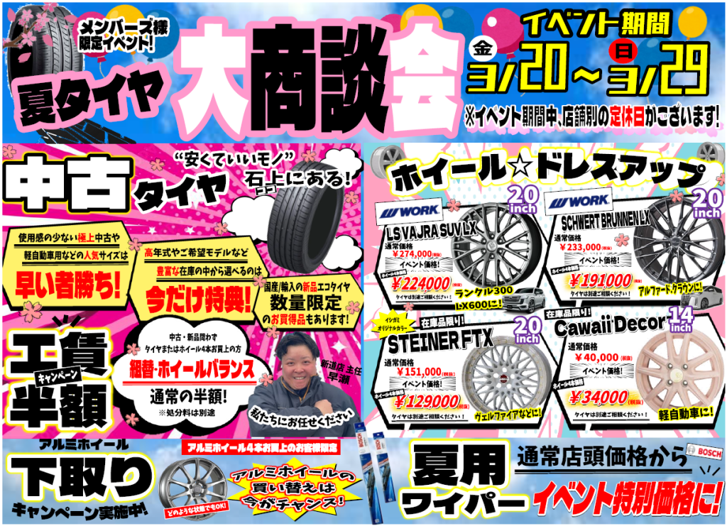 3月20日(金)~29日(日) タイヤショップ『夏タイヤ🛞大商談会🤩』を開催いたします